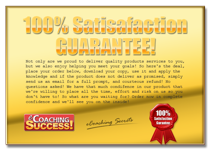 We make every effort to ensure that we accurately represent these products and services and their potential for income. Earning and Income statements made by our company and its customers are estimates of what we think you can possibly earn. There is no guarantee that you will make these levels of income and you accept the risk that the earnings and income statements differ by individual. As with any business, your results may vary, and will be based on your individual capacity, business experience, expertise, and level of desire. There are no guarantees concerning the level of success you may experience. The testimonials and examples used are exceptional results, which do not apply to the average purchaser, and are not intended to represent or guarantee that anyone will achieve the same or similar results. Each individual's success depends on his or her background, dedication, desire and motivation. There is no assurance that examples of past earnings can be duplicated in the future. We cannot guarantee your future results and/or success nor is this a guarantee of ways to make money online. There are some unknown risks in business and on the internet that we cannot foresee which can reduce results. We are not responsible for your actions. The use of our information, products and services should be based on your own due diligence and you agree that our company is not liable for any success or failure of your business that is directly or indirectly related to the purchase and use of our information, products and services. ClickBank is a registered trademark of Keynetics Inc., a Delaware corporation. eCoaching Success is not affiliated with Keynetics Inc. in any way, nor does Keynetics Inc. sponsor or approve any eCoaching Success product. Keynetics Inc. expresses no opinion as to the correctness of any of the statements made by eCoaching Success in the materials on this Web page.
