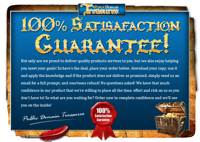 We make every effort to ensure that we accurately represent these products and services and their potential for income. Earning and Income statements made by our company and its customers are estimates of what we think you can possibly earn. There is no guarantee that you will make these levels of income and you accept the risk that the earnings and income statements differ by individual. As with any business, your results may vary, and will be based on your individual capacity, business experience, expertise, and level of desire. There are no guarantees concerning the level of success you may experience. The testimonials and examples used are exceptional results, which do not apply to the average purchaser, and are not intended to represent or guarantee that anyone will achieve the same or similar results. Each individual's success depends on his or her background, dedication, desire and motivation. There is no assurance that examples of past earnings can be duplicated in the future. We cannot guarantee your future results and/or success nor is this a guarantee of ways to make money online. There are some unknown risks in business and on the internet that we cannot foresee which can reduce results. We are not responsible for your actions. The use of our information, products and services should be based on your own due diligence and you agree that our company is not liable for any success or failure of your business that is directly or indirectly related to the purchase and use of our information, products and services. ClickBank is a registered trademark of Keynetics Inc., a Delaware corporation. Public Domain Treasures is not affiliated with Keynetics Inc. in any way, nor does Keynetics Inc. sponsor or approve any Public Domain Treasures product. Keynetics Inc. expresses no opinion as to the correctness of any of the statements made by Public Domain Treasures in the materials on this Web page.