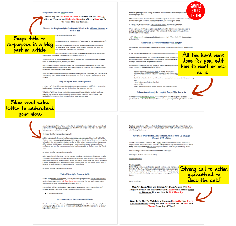 You want to give your new niche product a name, an identity or build a brand but don't know what to call it or what tagline to use. Use the sales letters to help you come up with a catchy name that even cold traffic can instantly relate to. This alone will make you stand out from the competition and attract more customers to you.