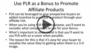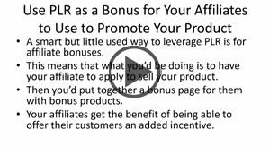 Give your product sales an instant boost with the marketing power of affiliates. In this video you'll discover how to re-position PLR as bonuses that affiliates can offer to their customers. |